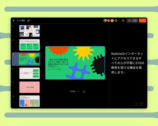 Figma Slidesを使うと、チームの誰もが美しく効果的なプレゼンテーションを作成することができます。