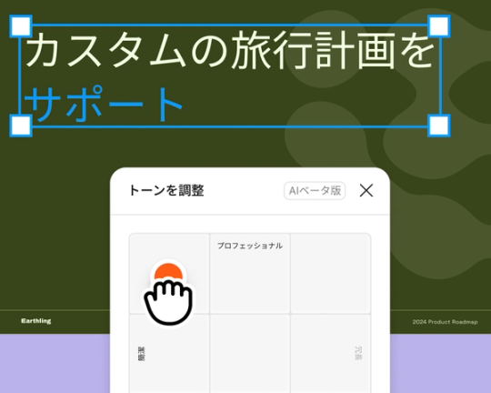 テンプレート、テーマ設定、AIを活用したライティングツールを使用して、ブランドに合ったプレゼンテーションを作成できます。シングルスライドビューとグリッドビューとの切り替えにより、構造化されたフレームワーク内での視覚的な思考が可能になります。