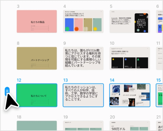 ズームアウトしてプレゼンテーションの全容を俯瞰。複数のスライドを簡単にグループ化し、プレゼンテーションのセクションを移動することができます。