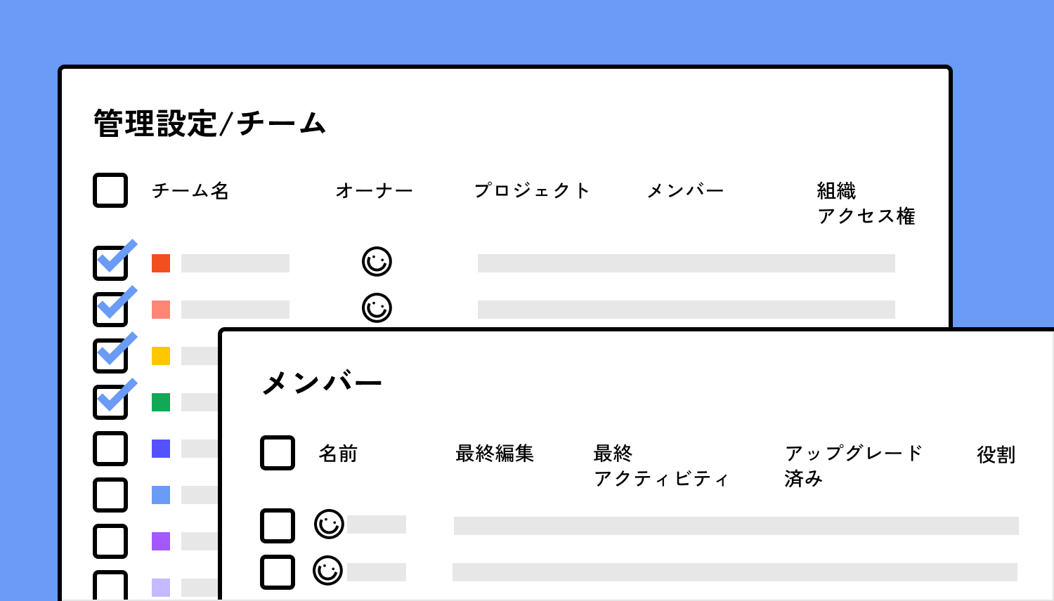 1つの管理ダッシュボードで会社全体のユーザー、チーム、請求、共有リソースを管理できます。