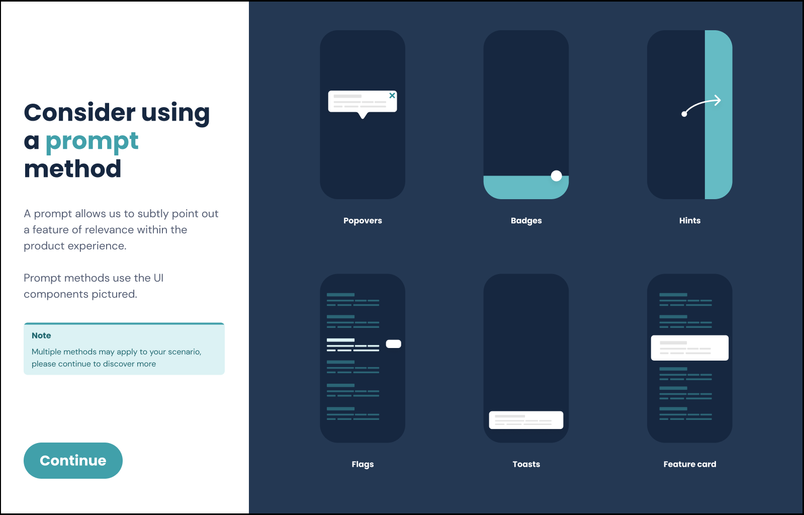 To encourage designers to contribute to the design system, the design systems team worked with them to produce component specs and reusable design patterns that they could share across the organization. They even created tools in Figma to offer guidance on which components to use in a particular scenario, like how to onboard users to a new product or feature.