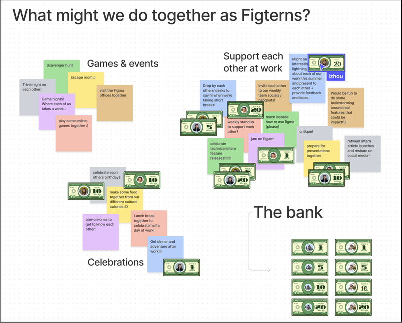 Prioritization is a core part of a product manager’s job, especially with input flying in from all directions. As a PM, you get a ton of feedback from users and teams across Figma, and the tough part is figuring out what to green-light (and all the great ideas to say no to). Buy a Feature is an exercise that the Figma PM team uses to map prioritization to time and resources. Everyone starts the exercise with a certain amount of currency (Kelsey makes bills that feature her team members), then the PM sets an amount of time for everyone to “invest” in different product ideas or focus areas. “It gives you a sense of how much people would invest in an area, not just a stack-rank list,” Kelsey explains.