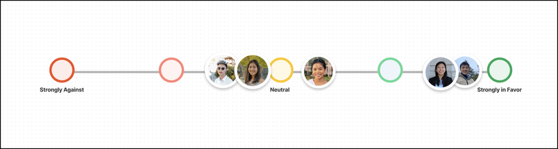 Our PM team also uses alignment scales to tease out their convictions about product decisions. To start, the team comes up with a direction or a list of statements and beliefs to guide the work. Each teammate logs their opinions by placing their built-in FigJam profile picture stamp somewhere on the scale, then makes comments and uses them to discuss.