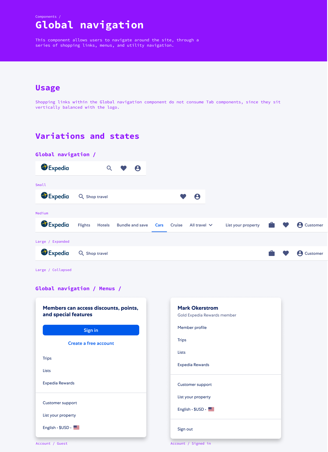 Below is an example of one of Expedia's Global Navigation components, which shows off their system well.