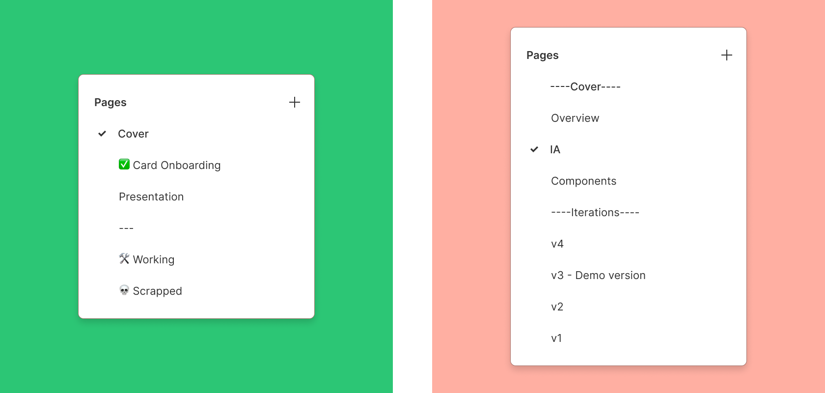 Naming pages to indicate what's ready for implementation — Each of the designers I spoke with used pages within files to separate what was still being worked on, what was ready for feedback, and what was ready to build, while also making space for the iterations along the way. Did you know you can use emojis in page names? Go ahead, get creative! 🏗️, 💭, 🚢.