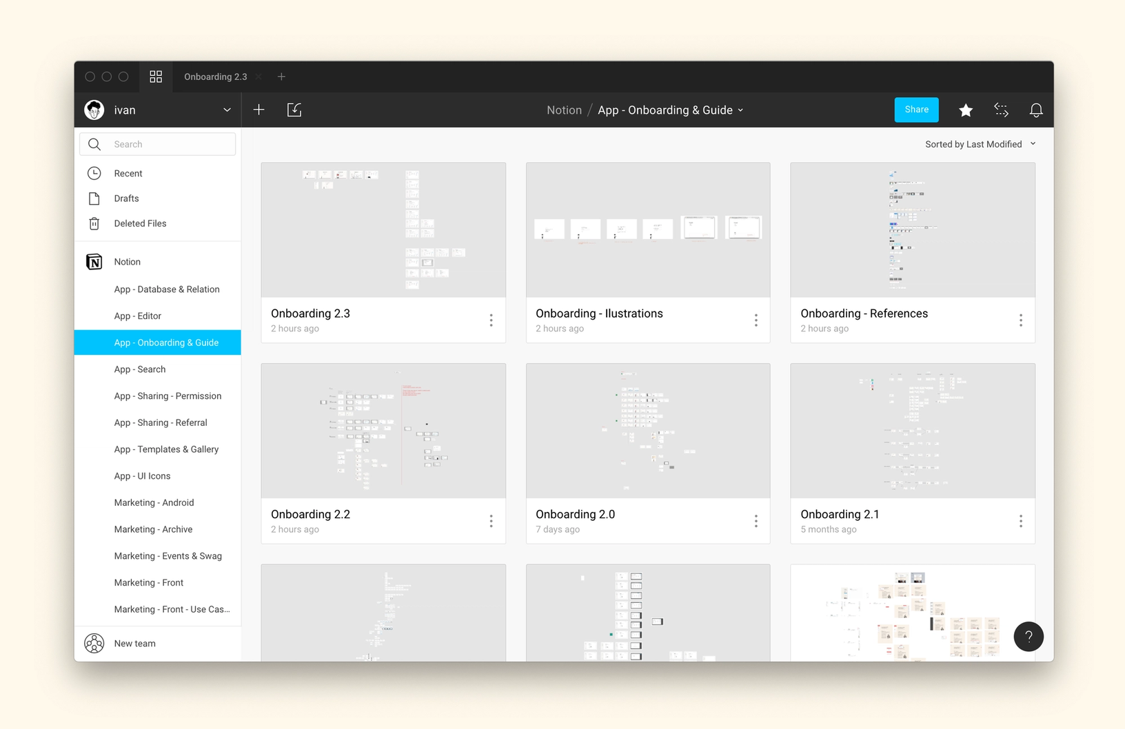 With that kind of record, people can learn from the mistakes of those who came before them. Notion’s Figma workspace is divided into a granular folder tree structure that makes it simple to navigate to any past project.